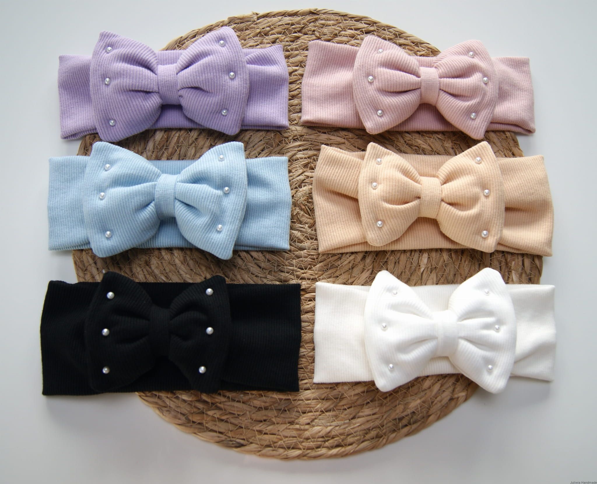 Opaski prążkowane z kokardą z perełkami szyte na podany obwód główki dziecka. Skład materiału 97% bawełny 3% elastanu