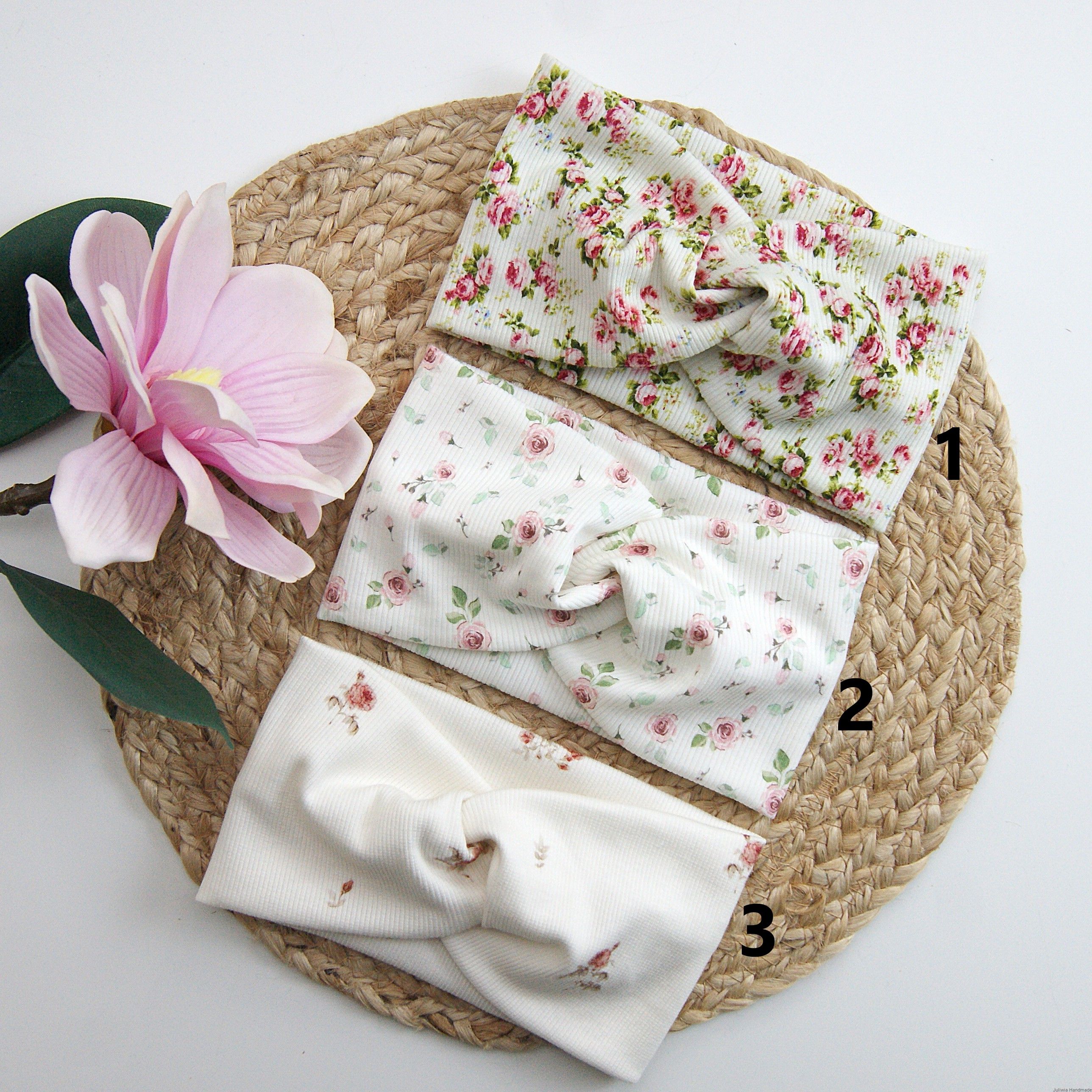 Opaska szeroka przeplatana dla dziewczynki – dzianina prążkowana w kwiaty